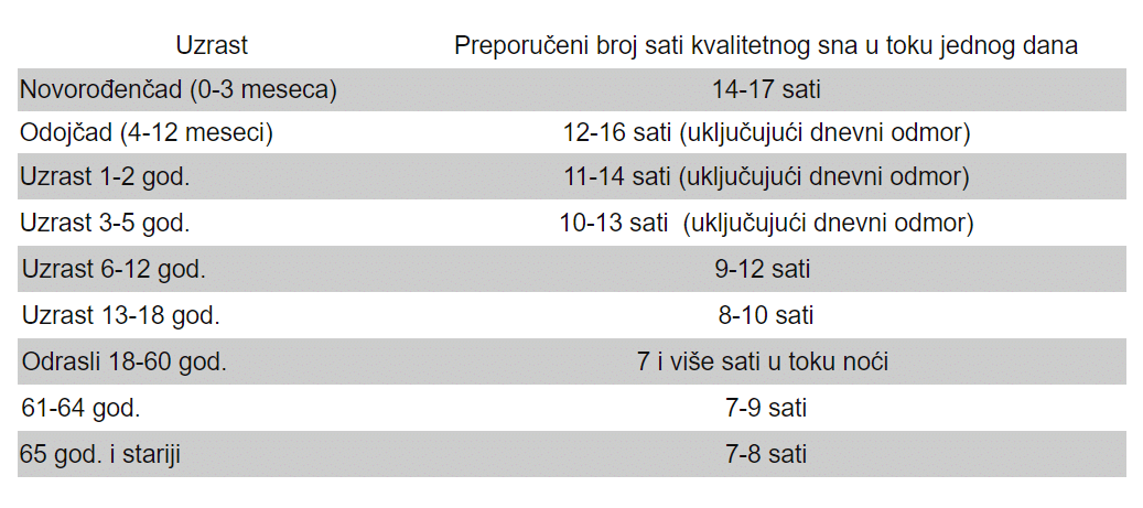 Potreba za spavanjem i broj sati neophodnog sna u toku 24 časa menja se sa uzrastom.